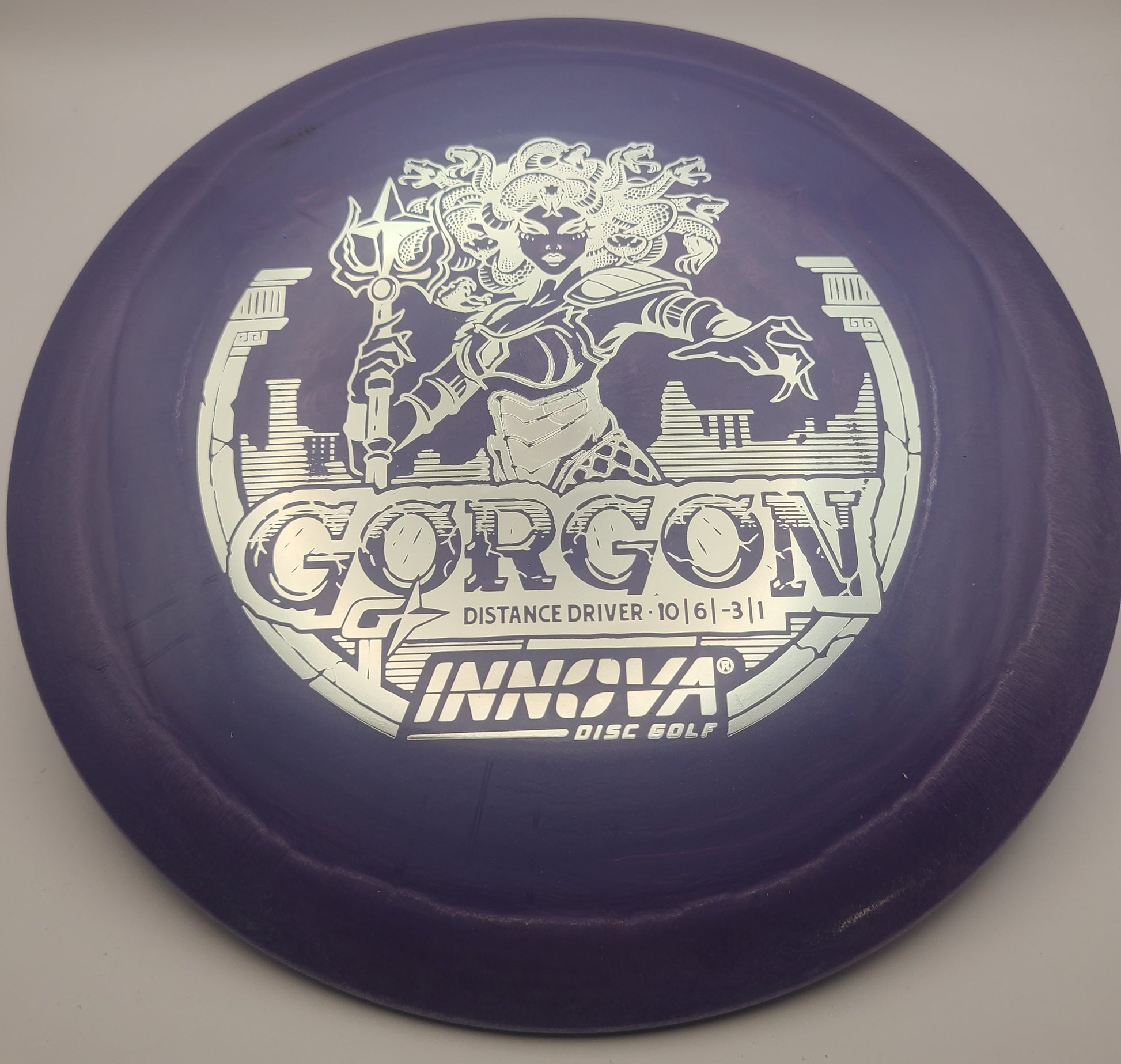 The Gorgon, a disc that merges the feel, precision, and ease of a Fairway Driver with the reach of a Distance Driver. Its flight: arrow-straight glide with a steadfast fade, mirroring the Gorgon's unwavering gaze. Experience the legend—drive like a deity, conquer the course.